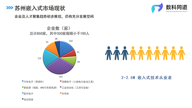 根据万象城AWC(中国)国际人力资源公司及数科同道业务团队对苏州市场的详细调研,现在苏州全市拥有嵌入式研发团队的企业数量为850家,主要集中在工业自动化、医疗电子、汽车电子等细分行业,其中百人以上规模企业500家。